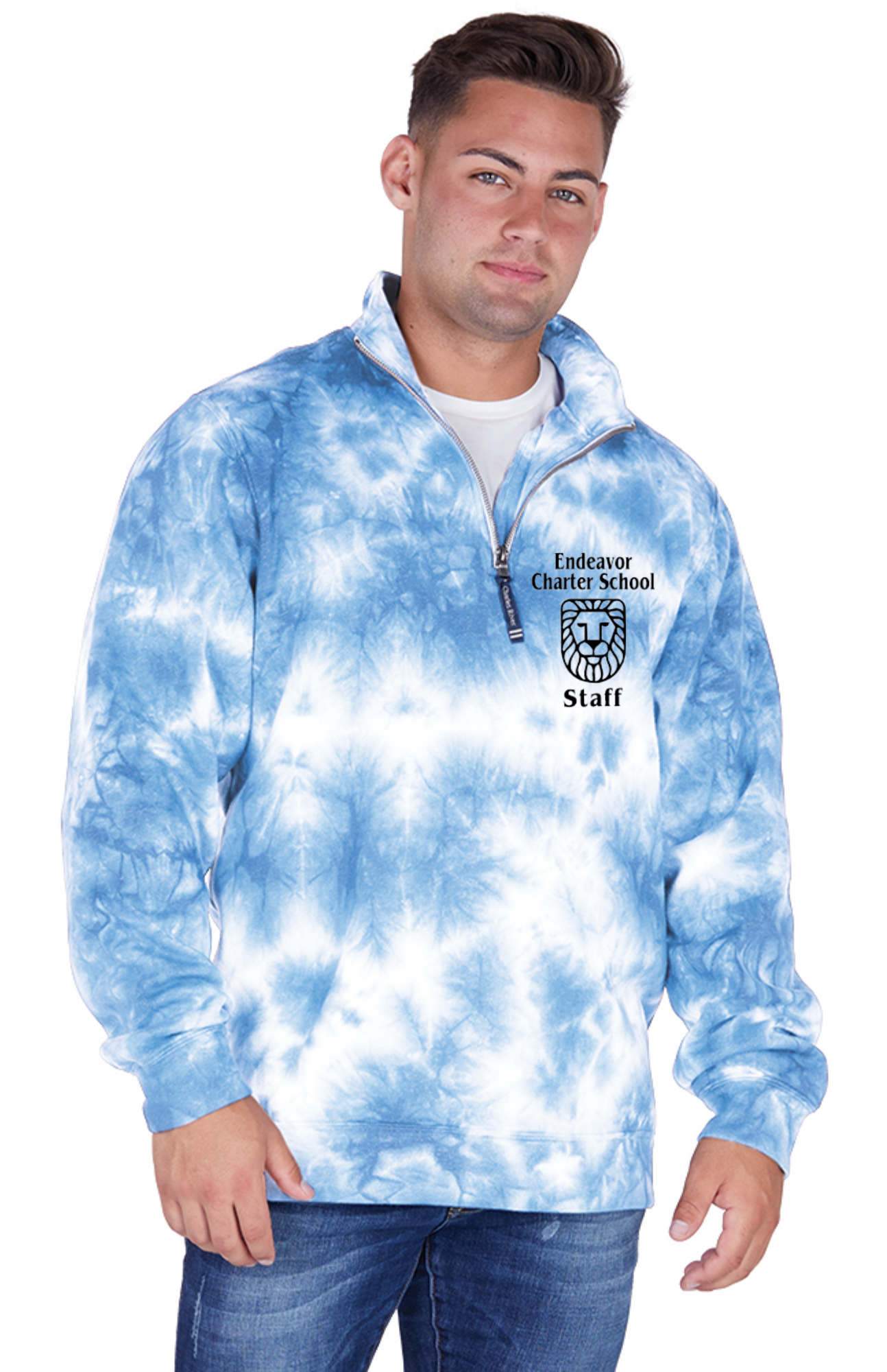 Screen printed Endeavor Staff Logo included on right front chest area. Available in black, oxford heather, white or light blue tie dye. Other colors may be available by special request.